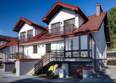 Dom wybudowany w systemie tradycyjnym. Drzwi antywłamaniowe Gerda, brama Wiśniowski, stolarka drewniana. Dach pokryty dachówką. W domu zastosowano ogrzewanie gazowe, piec de Dietrich. Na parterze ogrzewanie podłogowe, w garażu i na piętrze kaloryfery.